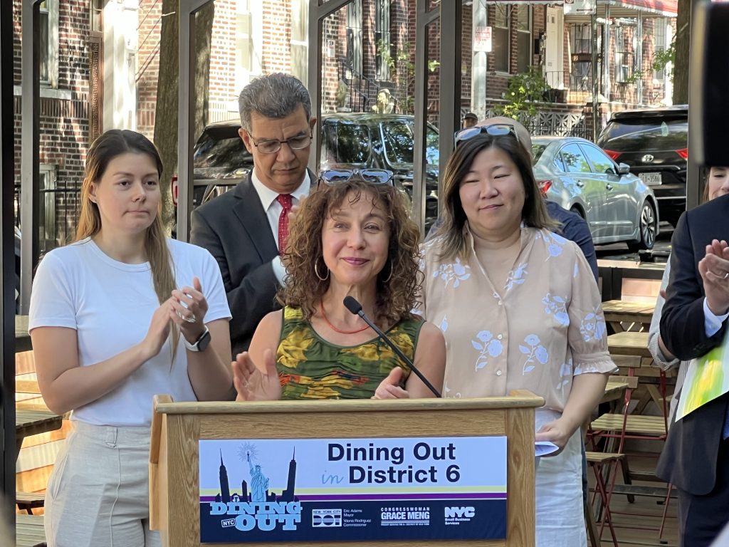 “I believe that we must provide our restaurants with the tools that they need to succeed, and that’s why I’m thrilled to have fought for and secured this vital funding totaling $2 million,” Meng said to the crowd. “These free dining setups will help dozens of restaurants in my congressional district here in Queens grow and thrive, and just in time for summer.”