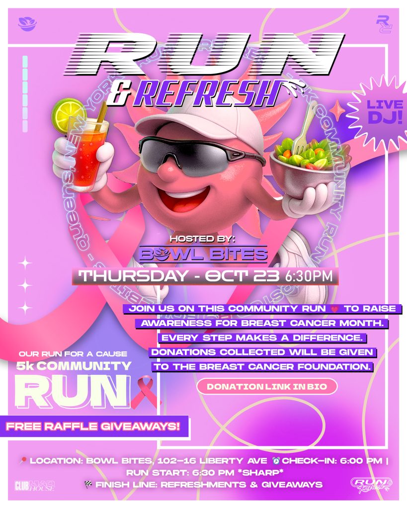 Bowl Bites, the Caribbean-inspired fast casual restaurant in Ozone Park, Queens, is once again showing its heart for the community. This October, in honor of Breast Cancer Awareness Month, Bowl Bites is raising funds to purchase and deliver care packages for local cancer patients. The initiative will culminate with the restaurant’s community 5K run on Thursday, October 23, followed by a hospital delivery of care packages on October 24, the day after the run.
