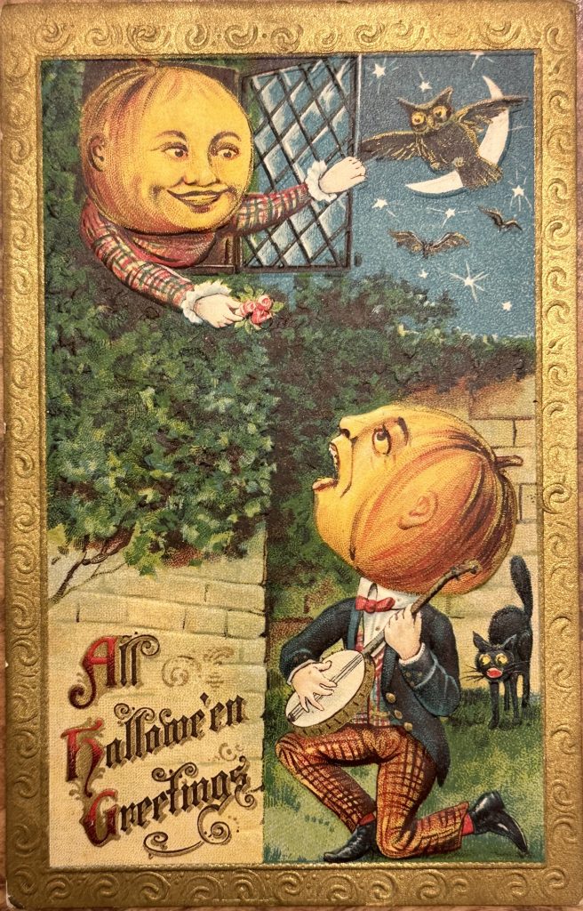 Pumpkins, black cats, witches, ghosts, scarecrows, and gourds are coming alive in unique ways, if one is fortunate enough to pick up an early twentieth-century Halloween postcard. Halloween was traditionally spelled “Hallowe’en” and originated from “All Hallows’ Evening” in Old English. It was customary to mail a highly stylized Hallowe’en postcard, which consisted of fine illustrations, themes ranging from horror to humor and romance to fortune-telling, calligraphy, poetry, Victorian and Art Nouveau designs, and embossed features.