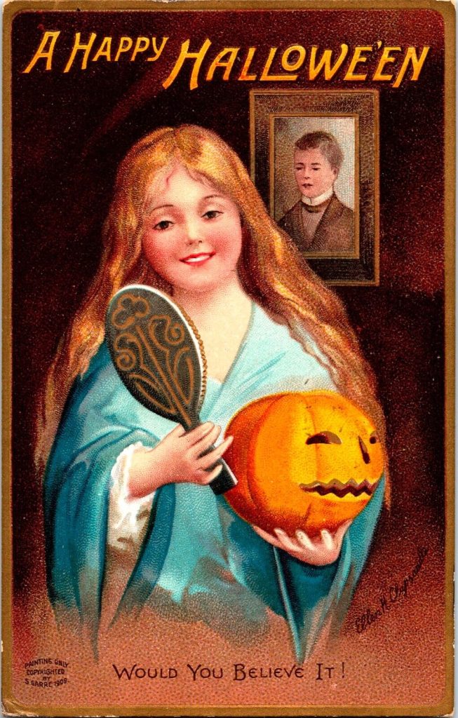Fred C. Lounsbury of Plainfield, New Jersey and president of Crescent Embossing Company, was well regarded for his optimal quality greeting cards and postcards. His 1907 copyrighted postcard captures a Halloween superstition. A young woman in a florid gown visualizes going to a ball, as she holds a candle in her hand to faithfully light the way to her intended. Her future husband appears as she gazes into a floor mirror. The scene is complemented by a jack o’lantern, elegant gilding and Old English typography, and seasonal themes such as corn, a black cat, and a bat.
