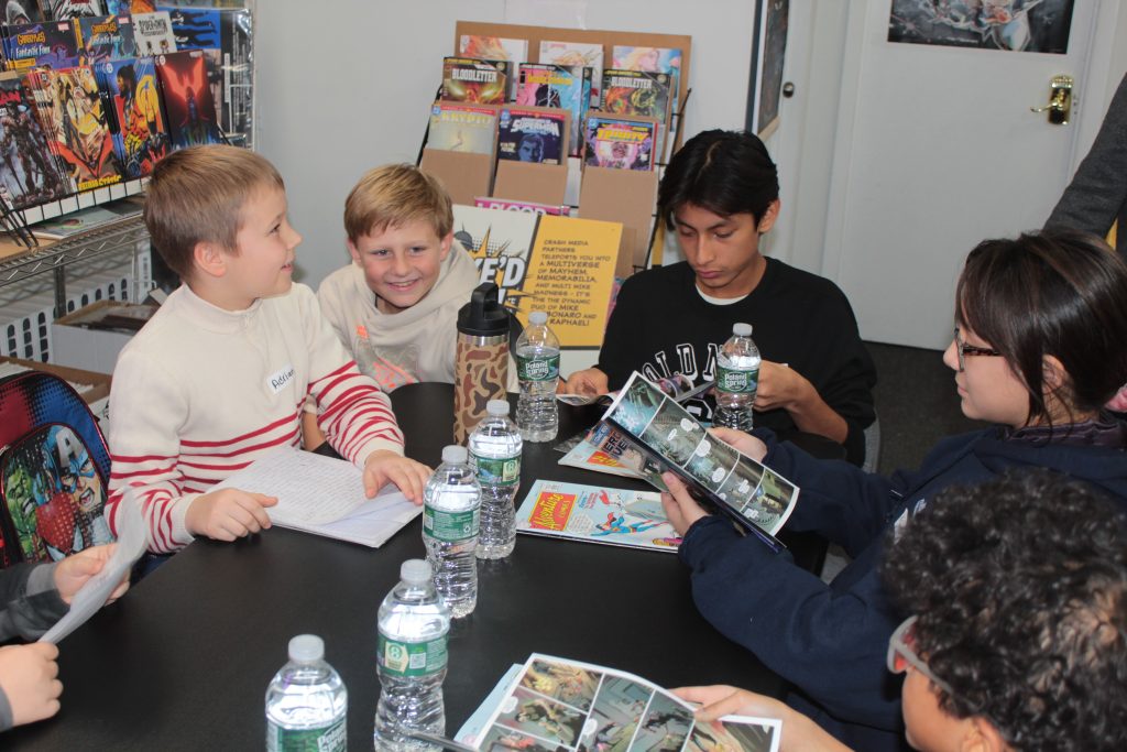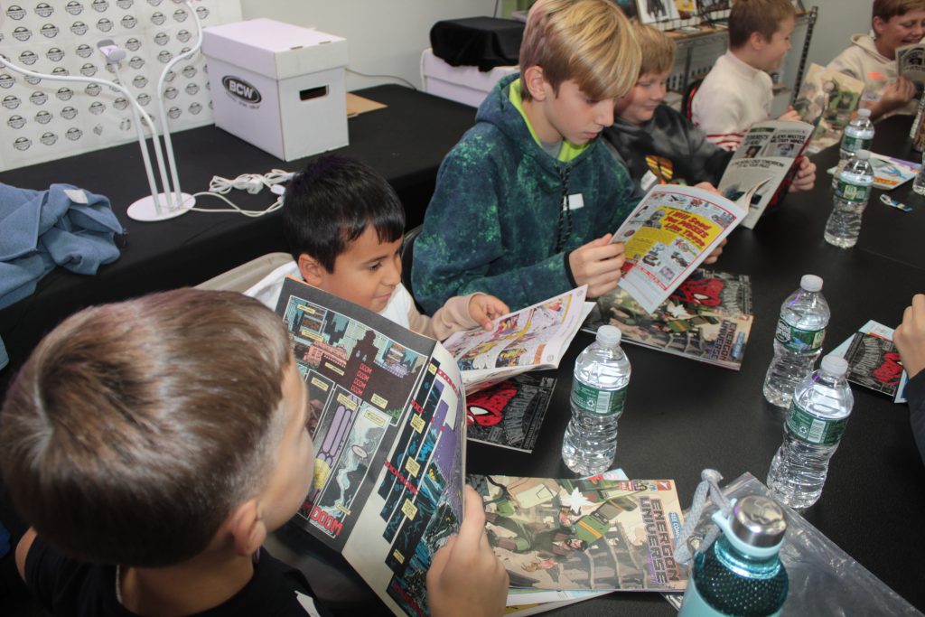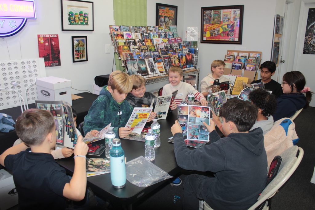 Young hockey players swapped pucks for pages of superheroes on November 14 during a Comic Book Trivia Roundtable hosted by Spineworks Comics NYC and Middle Village Players Roller Hockey. The event, held at Spineworks Comics’ Middle Village location, brought together teenagers from the local roller hockey league for an interactive exploration of comic book history, storytelling, and artwork.