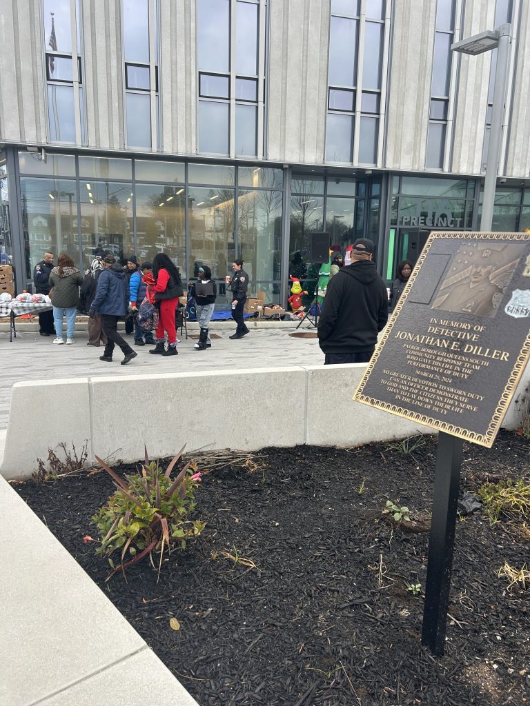 Then came the part that lingered. In front of the building stood a plaque: “IN MEMORY OF DETECTIVE JONATHAN E. DILLER,” the 31-year-old officer gunned down in Far Rockaway in March 2024. His name, now etched in stone, watched over the same southeast Queens streets he once patrolled.