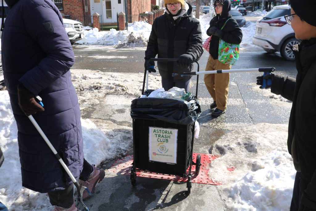 A dozen people walked like a group of polite grade schoolers down Steinway Avenue with mechanical trash grabbers in hand. With the slightly melted snow banks narrowing the sidewalk, they were forced to walk single file—pausing and shuffling to the side at times to let passersby through. For over an hour, they weaved onto roads lined with grey slush and on top of ice patches all to collect stray pieces of trash.