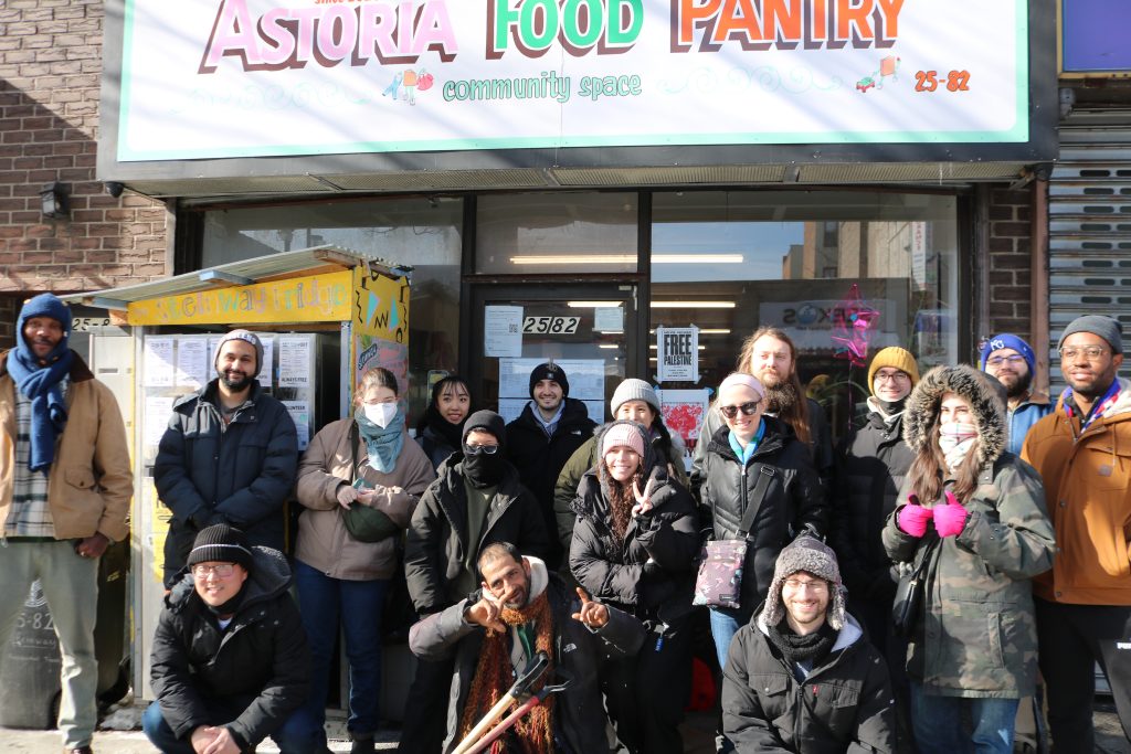 Before heading out to eat together, the groups combined to take a photo outside the pantry. A man shoveling the block thanked them for their work and asked them to also help shovel the neighborhood when they got a chance. He was invited into the photo, surrounded by a few members making hearts and peace signs.