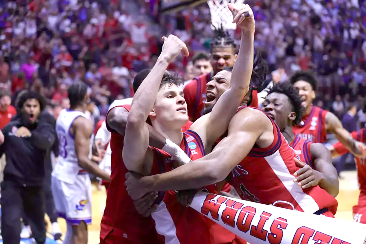 Dylan Darling is swarmed by teammates after his buzzer-beating layup as St. John’s advanced past the second round for the first time in over two decades! Photos courtesy St. John’s basketball.
