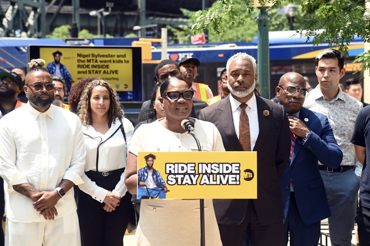 MTA Chief Customer Officer Shanifah Rieara and NYCT President Demetrius Crichlow join professional BMX athlete Nigel Sylvester at Queens Plaza to announce new initiatives in the “Ride Inside, Stay Alive” anti-subway surfing campaign on Wednesday, Jun 11, 2025.