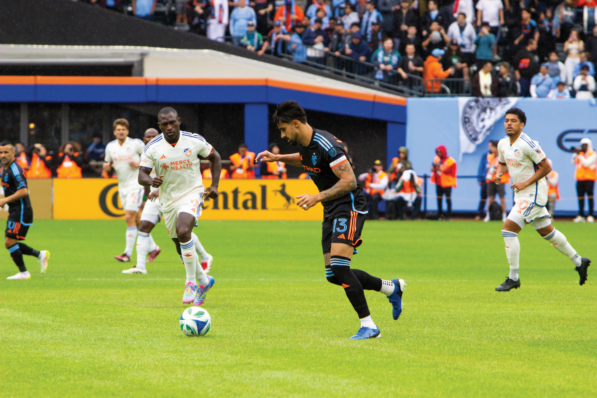 Wearing the captain’s armband and celebrating his 100th appearance with the club, Thiago Martins was effective on both ends of the pitch early in the first half. He was able to fend off Cincinnati’s attackers while delivering piercing through balls to spring the NYC offense. Just a few minutes after the opening goal, Martins threaded a ball into New York’s attacking third.