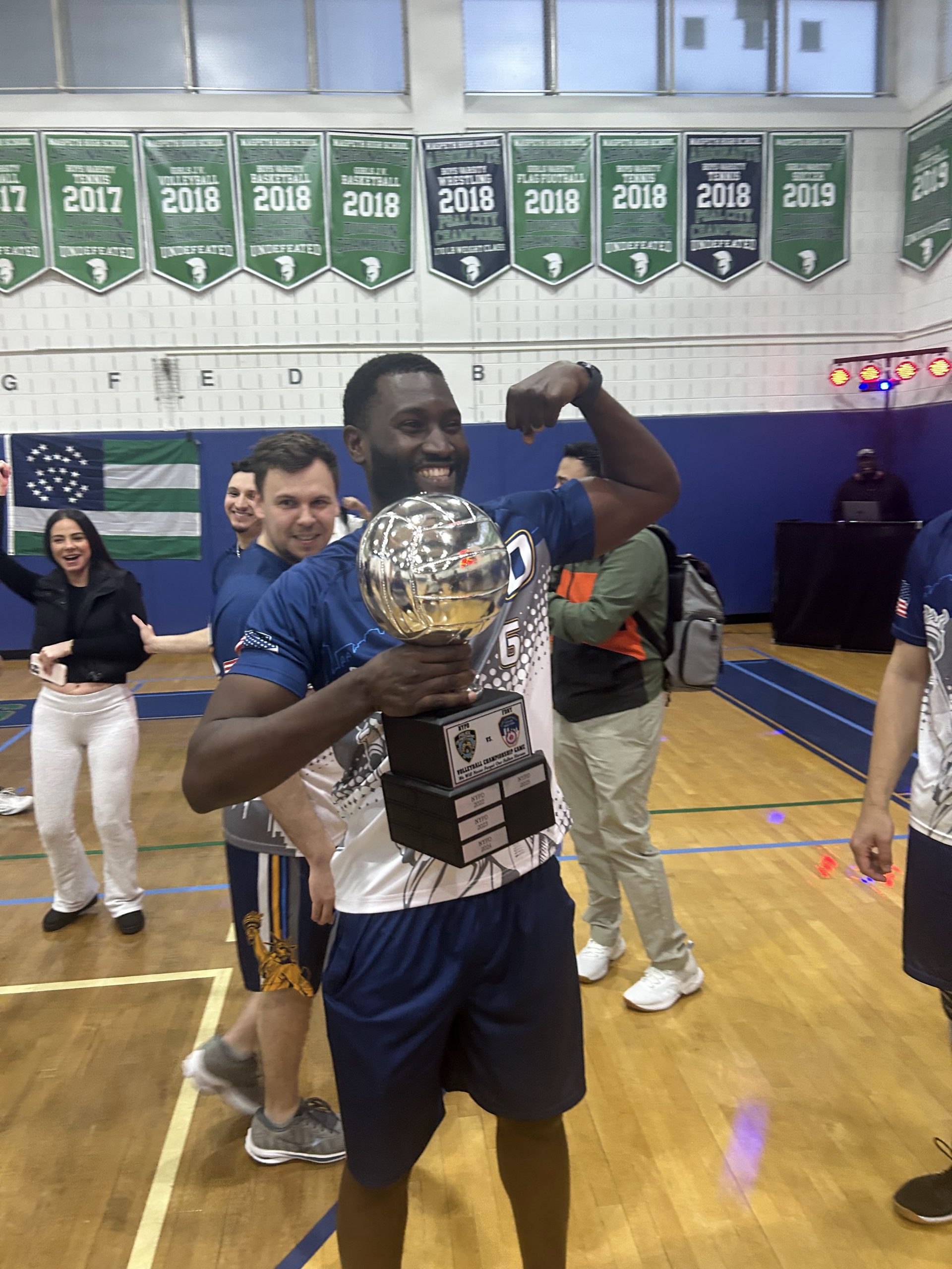 NYPD and FDNY players went head-to-head in a spirited volleyball match at Maspeth High School Gym, turning the Queens gym into a hub of energy,
